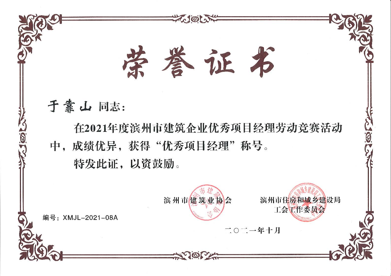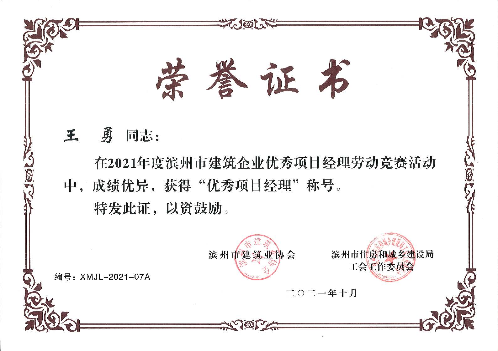 在滨州市住建局工会工委和滨州市建筑业协会组织的2021年度滨州市建筑企业优秀项目经理劳动竞赛活动中,经公司推荐、竞赛工作委员会评议审定和综合评审、网上公示等工作程序,我公司三名同志(王勇同志、房磊同志、于靠山同志)获评“优秀项目经理”称号。